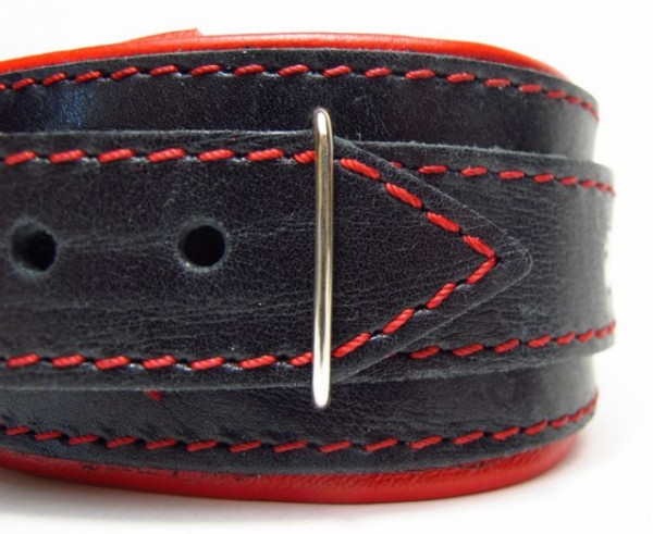 Снаружи ошейник выполнен из натуральной толстой ременной кожи черного цвета. Декорирован контрастной грубой строчкой красного цвета. Выглядит провокационно, как на нежной женской шейке, так и на мужской!