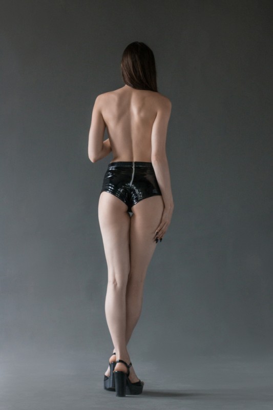 Выполнены трусики из высококачественной экокожи и винила в глубоком черном цвете. Не регулируемые. Сзади молния!