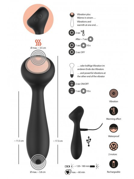 Ствол вибратора с увеличенной каплевидной головкой обеспечивает плавное введение и интенсивную стимуляцию! Обратная сторона вибратора (ограничитель) имеет плоскую скошенную поверхность с твердым покрытием, которая нагревается до 50C! Идеально для стимуляции наружных эрогенных зон, в особенности клитора!